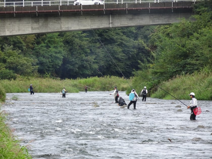 相模川漁連は水系のアユ分布状況や育ち具合を調べるために、8ヶ所23人によるアユ試し釣が実施されました。