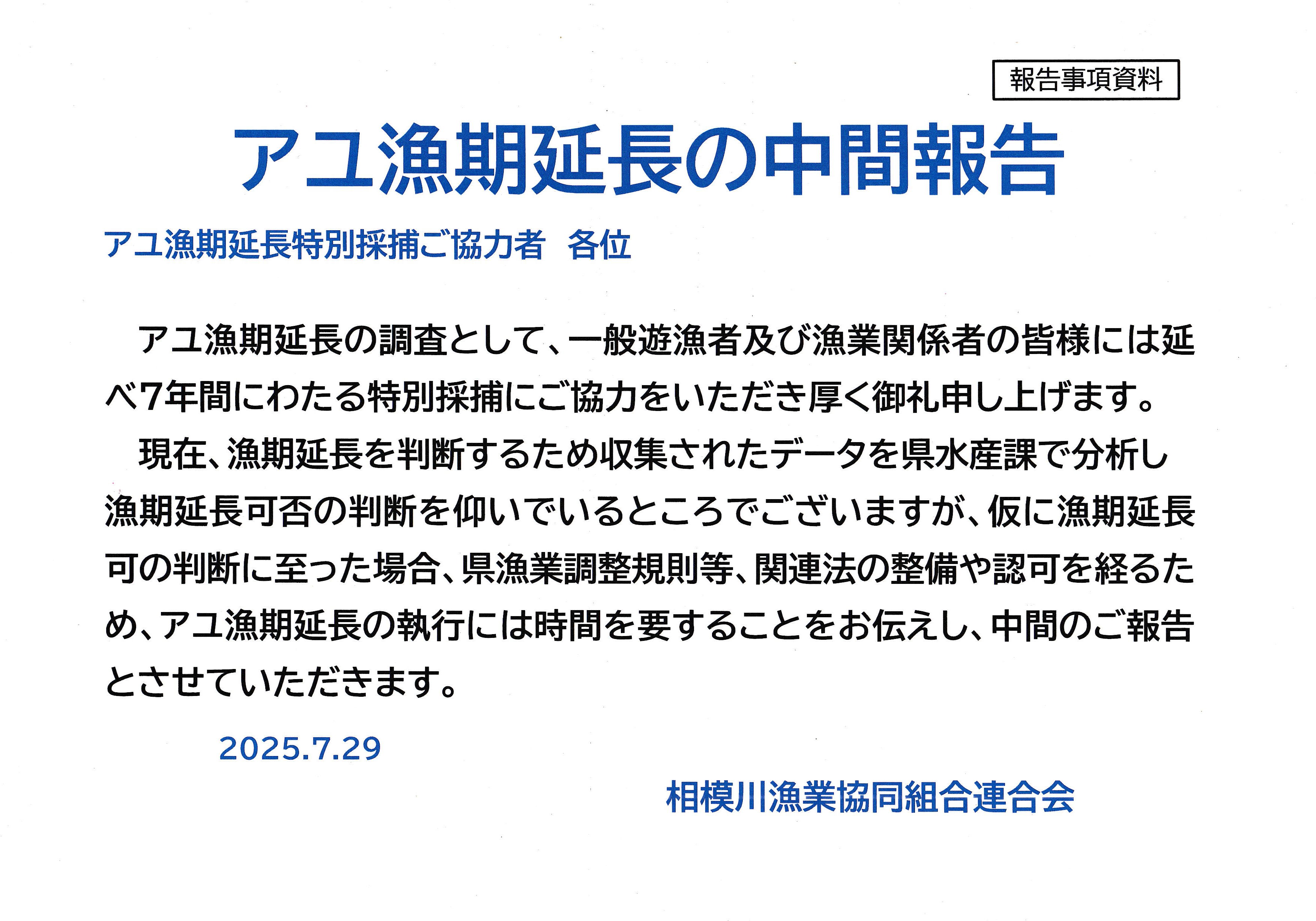 アユ漁期延長ですが、来期より可能と思われます。ご協力和頂いた遊漁者の皆様やオトリ屋さんなど、関係者のご協力に感謝を申し上げます。